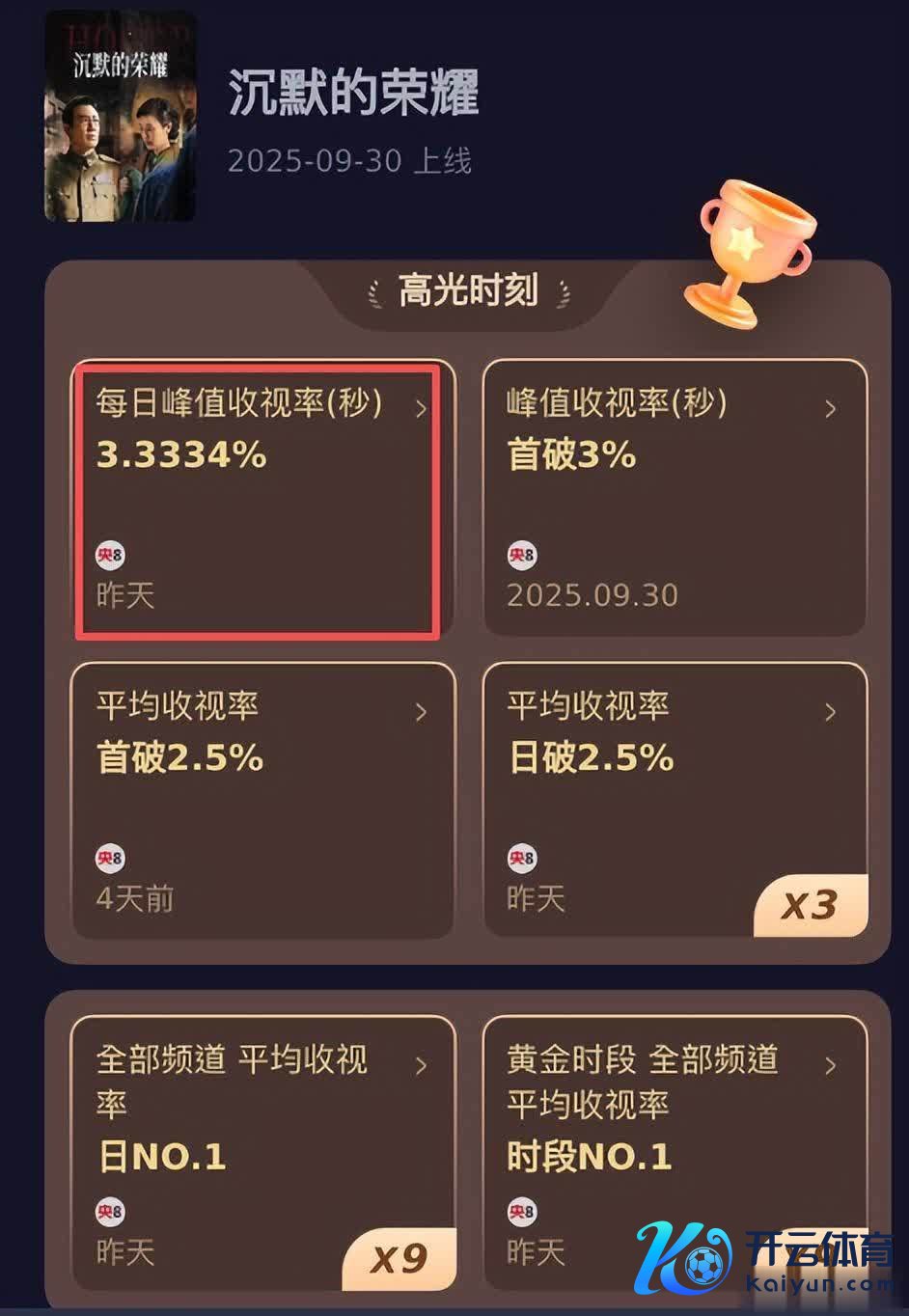 《千里默的荣耀》收视率全程破3,稳坐寰宇收视率冠军的宝座。